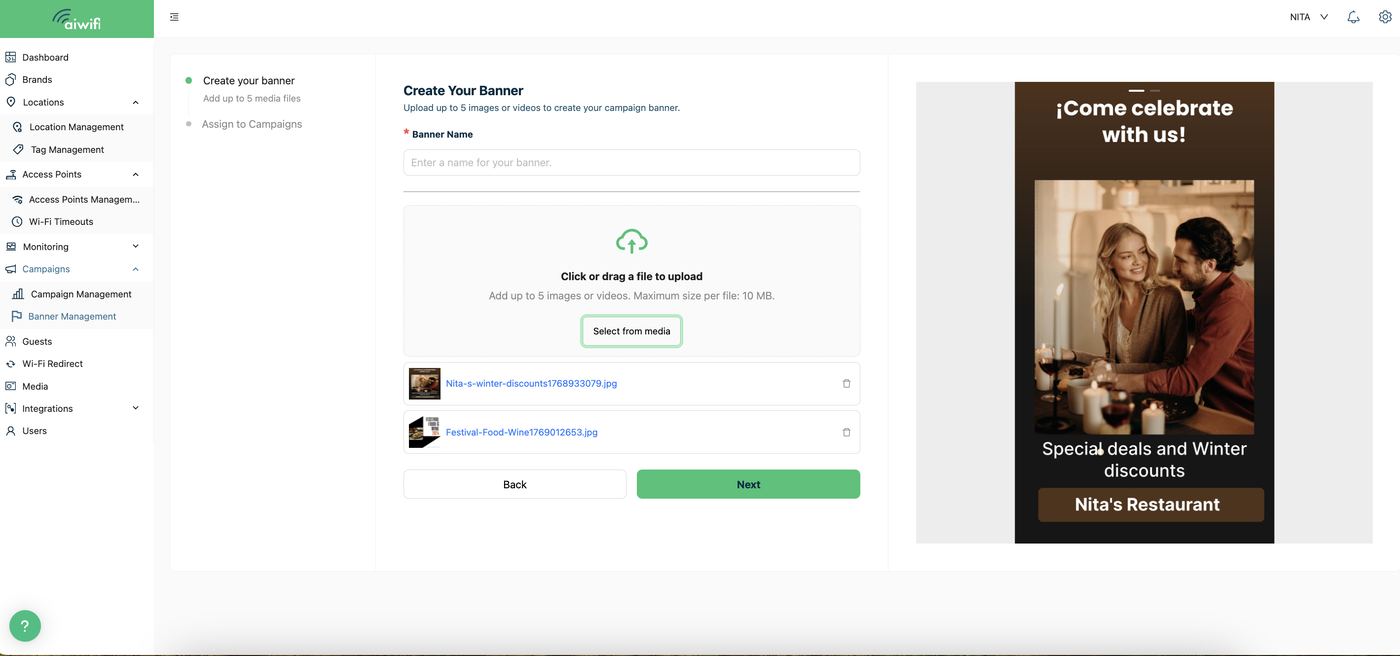 Click on "Select from media" to upload the images (maximum 5) you want to add to your banner. Or click on "drag your file from your browser" to upload the images or gifs you want to add to your banner.