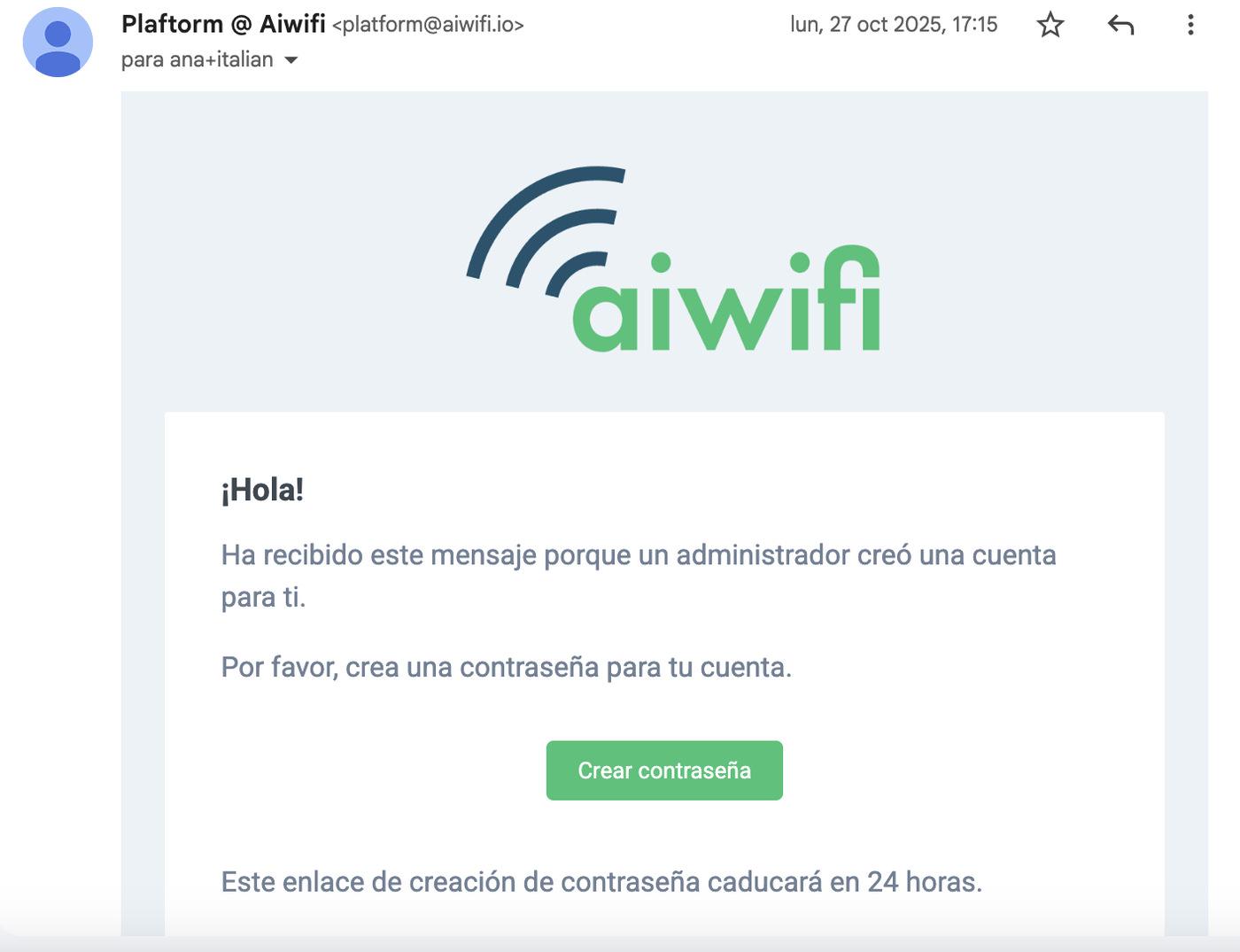 Aiwifi will sent a validation email to the new user with a link to create a new password to have access to the Captive Portal. This link will expire in 24 hours. Here is an example.