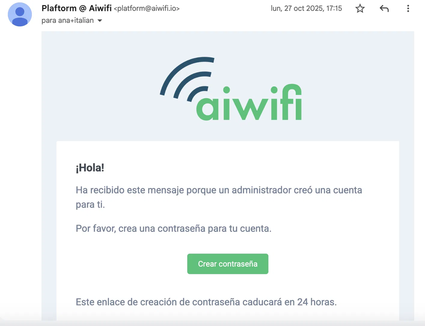 Aiwifi enviará un correo electrónico de validación al nuevo usuario con un enlace para crear una nueva contraseña y tener acceso al Portal Cautivo. Este enlace caducará en 24 horas.