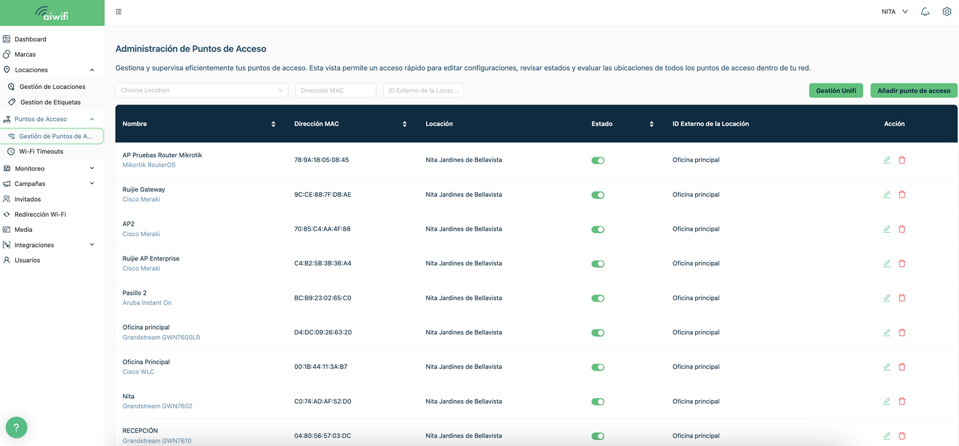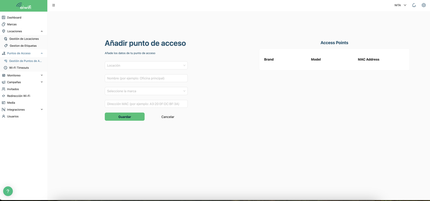 Los puntos de acceso son las antenas WiFi donde se configurará Aiwifi.