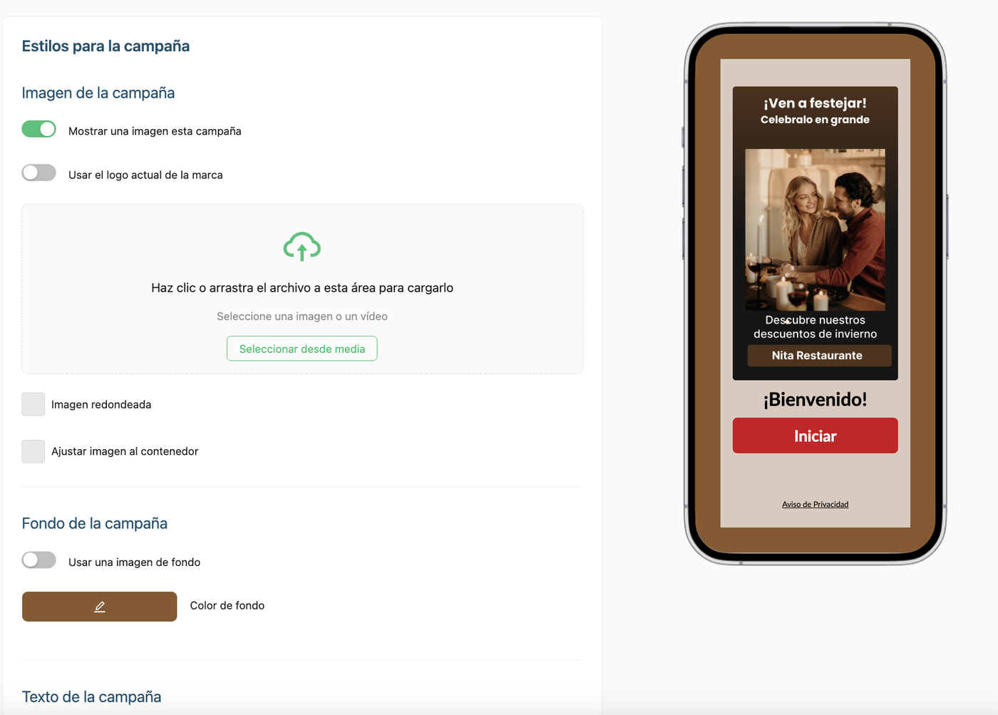 Fondo de Campaña.- Si deseas utilizar una imagen de fondo, puedes arrastrar tu archivo o hacer clic en "Seleccionar desde medios" si tienes imágenes o gifs en tu "Sección de Medios".