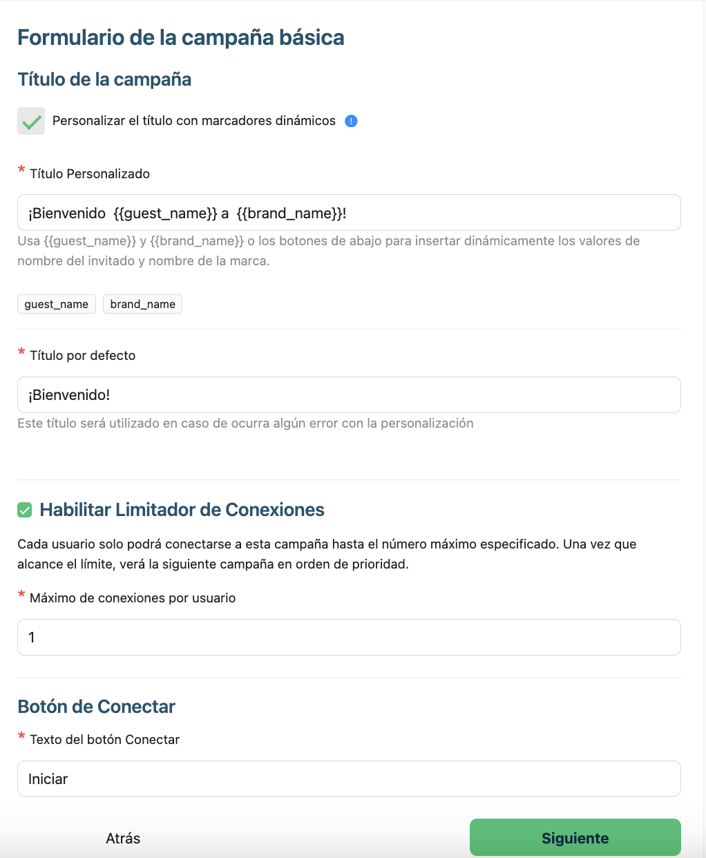 Habilitar limitador de conexiones: Cada invitado solo podrá conectarse a esta campaña hasta el número máximo especificado. Una vez que alcance el límite, verá la siguiente campaña en orden de prioridad.