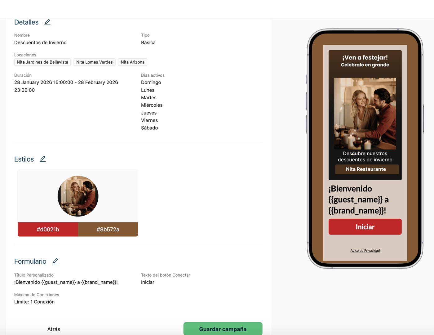 Máximo de conexiones por usuario: Aquí deberás escribir el número de veces que quieres que le aparezca a tu invitado esta campaña. Nosotros recomendamos por ser una campaña de promoción darle como máximo 2 conexiones o visitas.