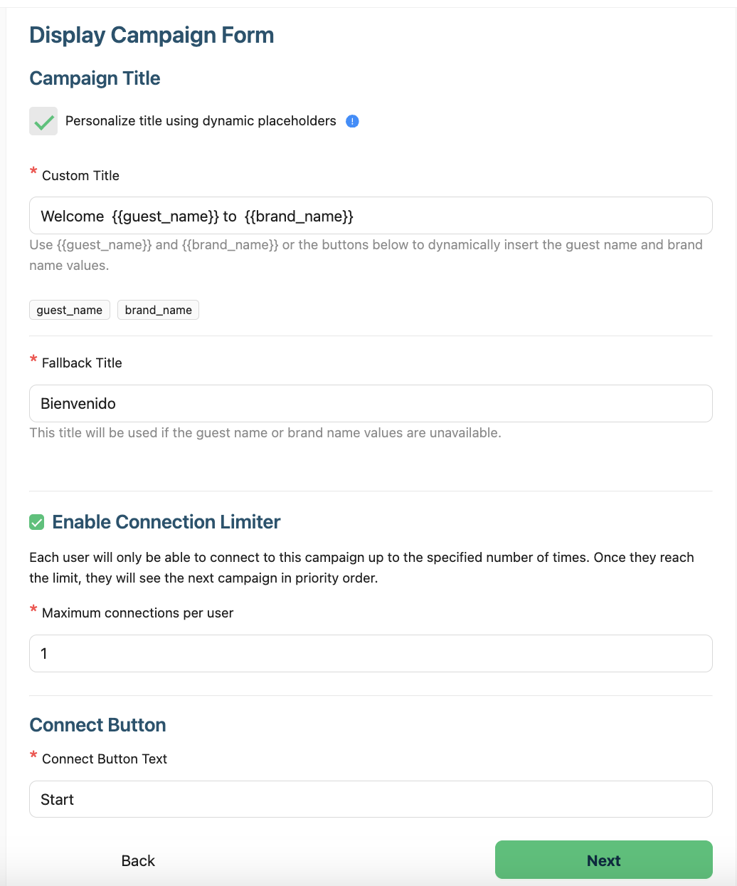 Enable Connection Limiter.- Each user will only be able to connect to this campaign up to the specified number of times. Once they reach the limit, they will see the next campaign in priority order.