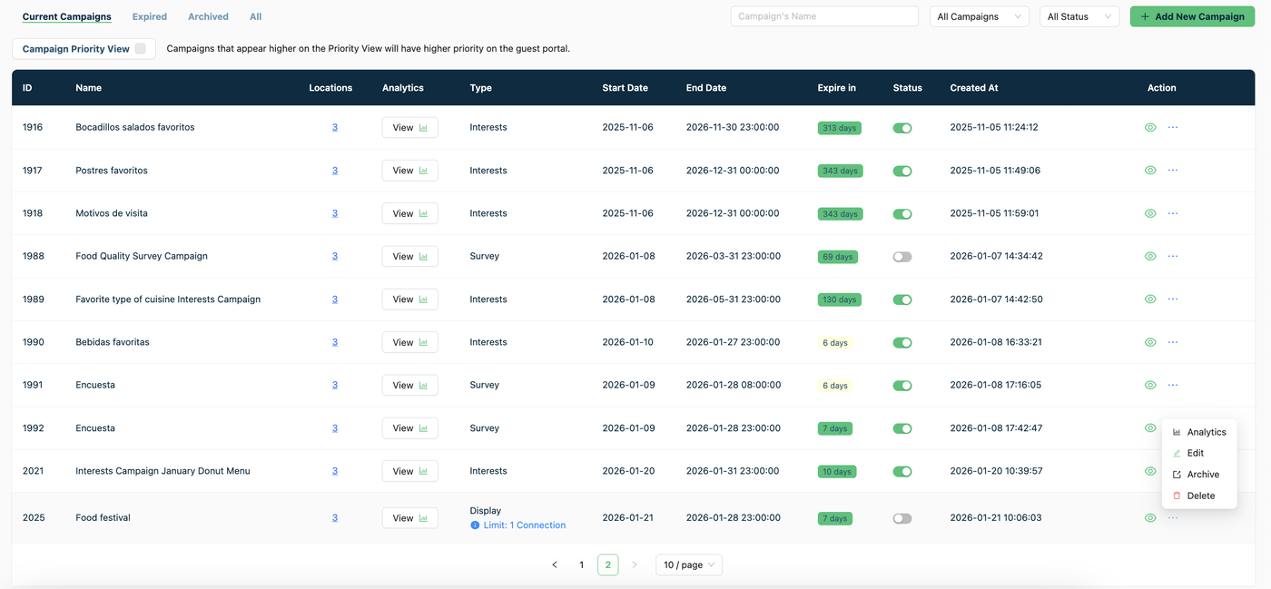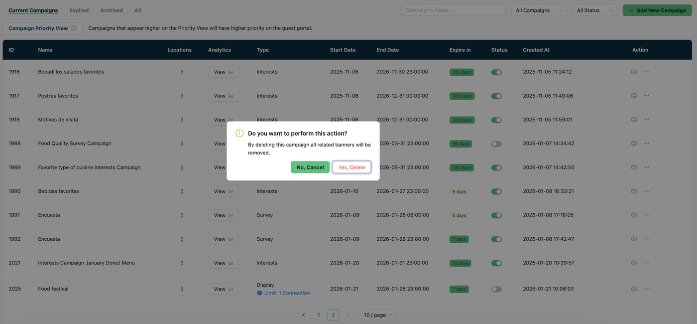 But the Rating Campaign, The Display Campaign, The Survey Campaign, The Interest Campaign and The Customer Experience Indicator (NPS) can be deleted, and when you deleted them their analytics are also deleted.
