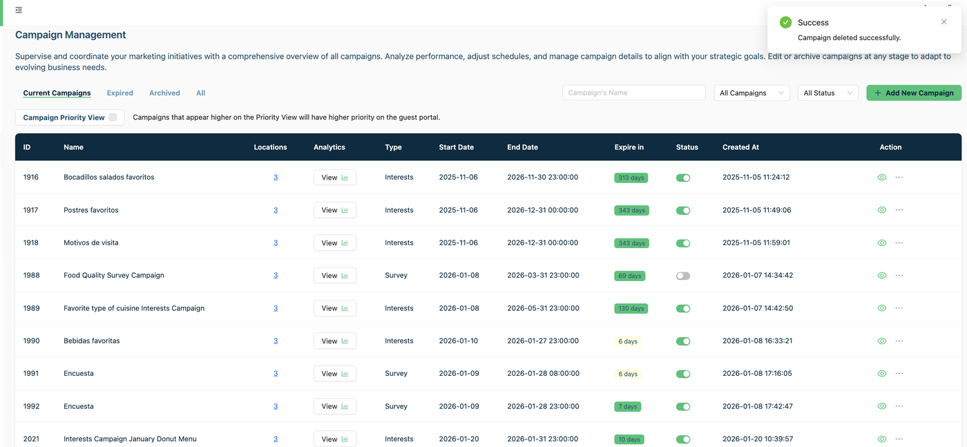 4.- On your dashboard you will see a dialog box “Your Campaign was deleted successfully”.