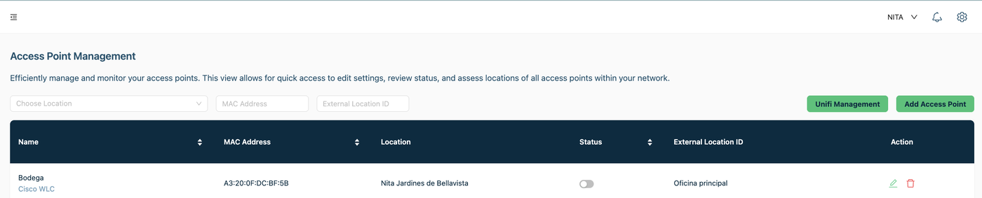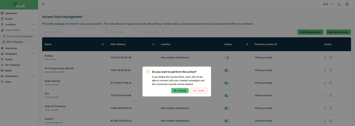 2. Press the "Delete icon" to remove your Access Point. On your screen it will appear the dialogue box" asking you if you want to perform this action. Press "Yes, Delete" if you want to remove the Access Point.