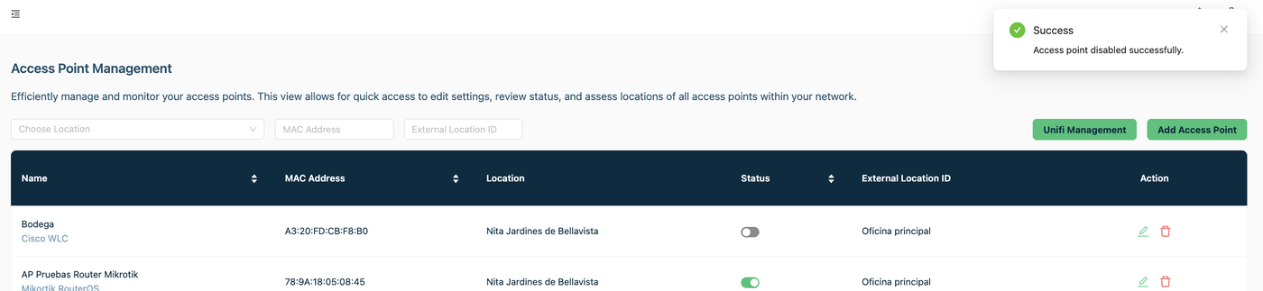 3.Once you pressed the button “Yes, Delete2 on your screen it will appear the dialog box “Success. Access pont disabled successfully”.