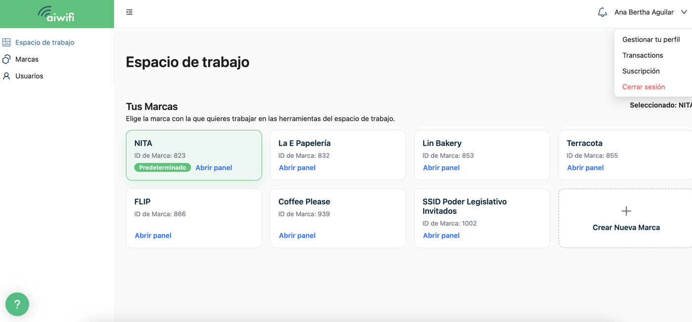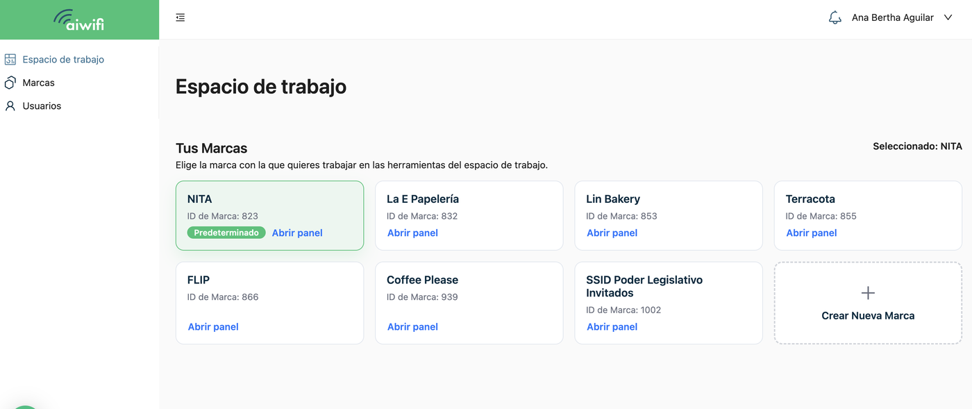 El Espacio de Trabajo es un panel; es un panel diseñado para darte el control total y simplificar la gestión de todas tus cuentas y marcas. En el podrás visualizar tus marcas. Selecciona la marca en la que quieras entrar para visualizar las campañas, banners o funcionalidades que debas editar.