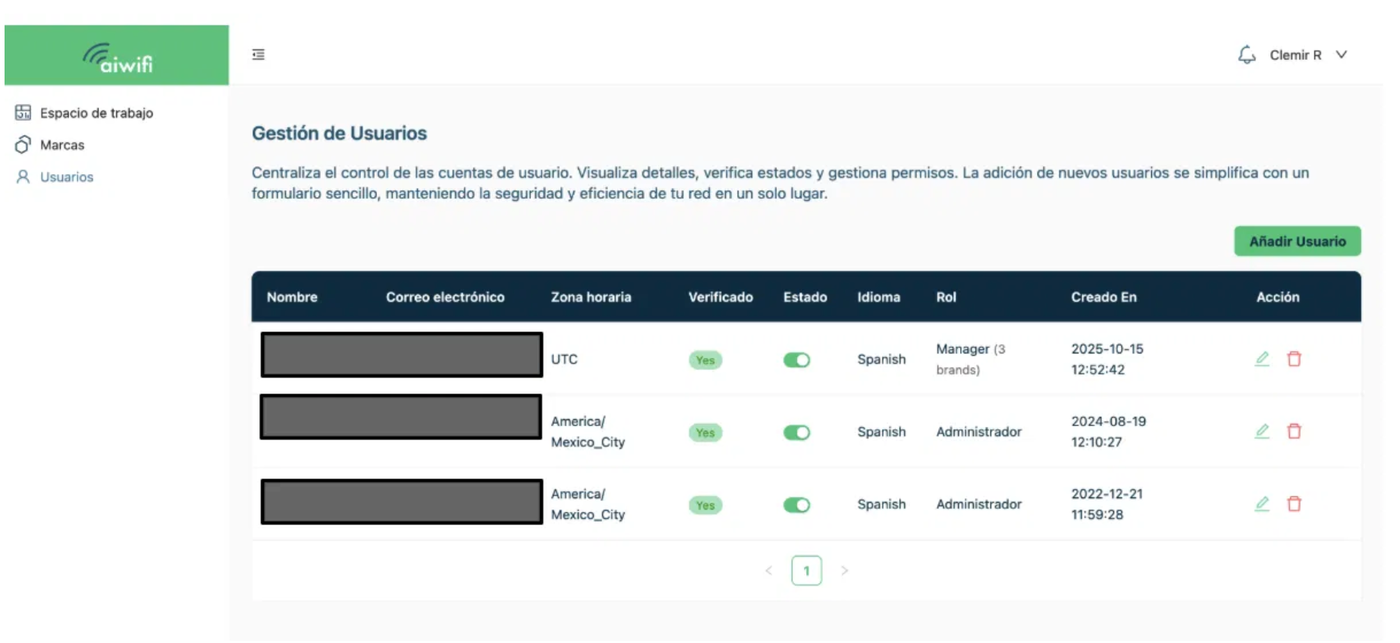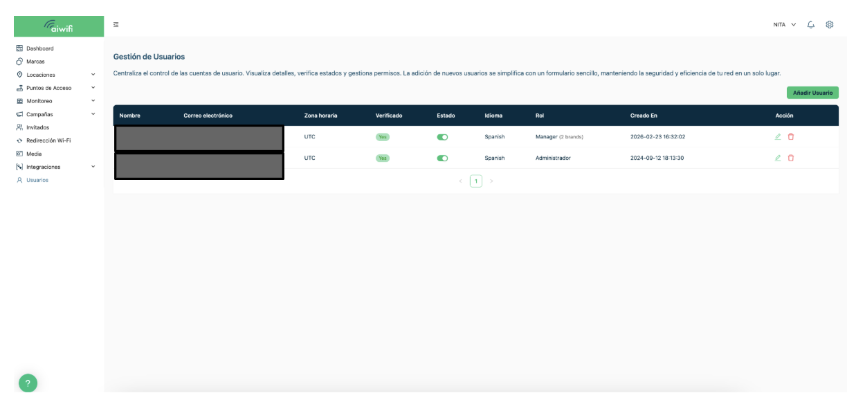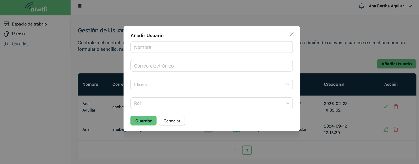 Para añadir un usuario a la plataforma Aiwifi, solo deberás dar clic en el rubro de la derecha “Añadir Usuario”.