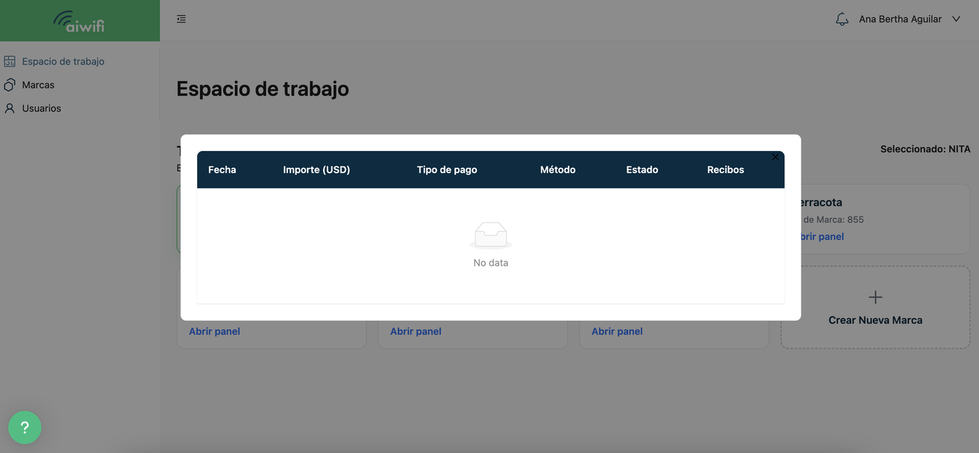 En esta sección si eres Usuario Propietario o Administrador podrás visualizar los pagos y transacciones realizadas de tu plataforma Aiwifi.