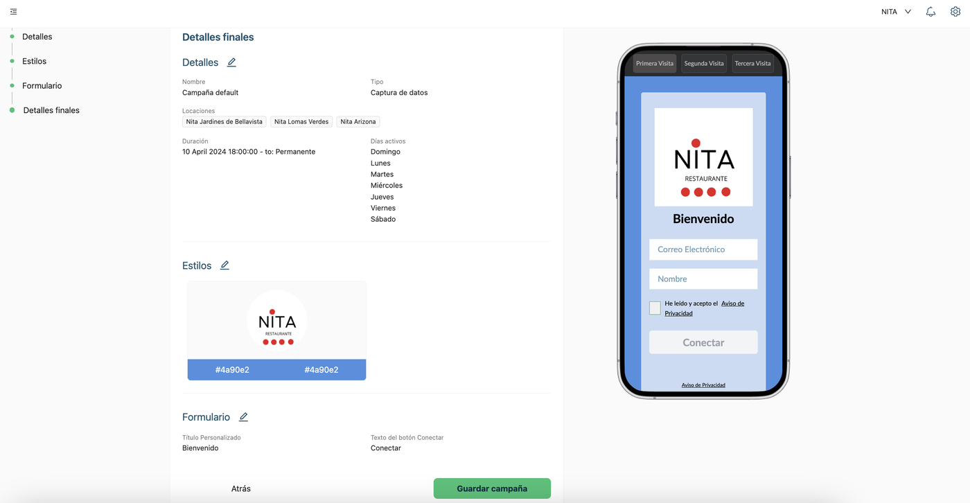 3) Confirma tus Detalles y Estilos de tu Campaña Predeterminada